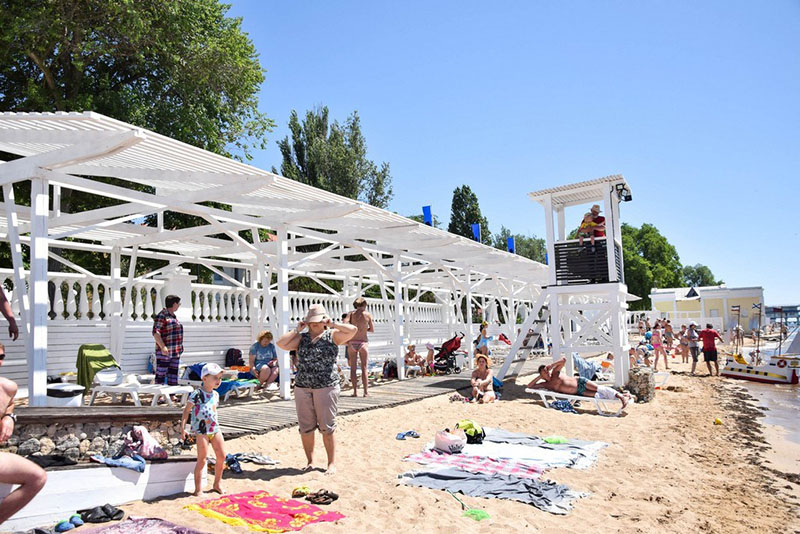 Конечно же, пляж оборудован всем необходимым для комфортного и безопасного отдыха: душевые кабины, кабины для переодевания, питьевые фонтаны, ногомойки, камеры хранения. Создана доступная среда для людей с ограниченными физическими возможностями — отдельные кабины для переодевания, душевые, пандус, дорожки. Предусмотрена зона солярия с теневыми навесами и шезлонгами. На всей пляжной территории установлена система видеонаблюдения