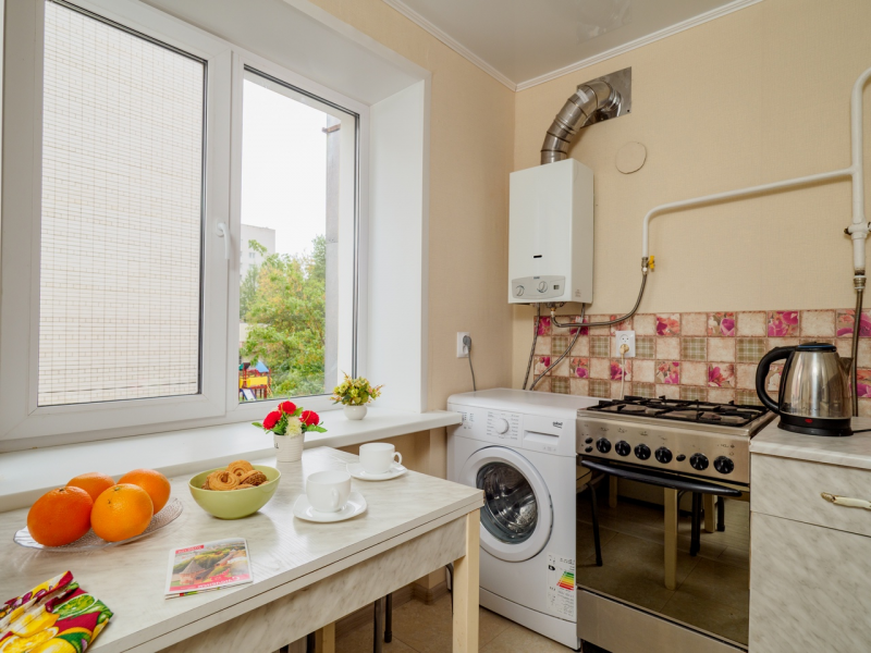 Компактная кухня оборудована современной мебелью и всей нужной для длительного проживания бытовой техникой. В распоряжении гостей квартиры полный комплект посуды и кухонной утвари на четыре персоны, чтобы чувствовать себя как дома и готовить привычный рацион по своему вкусу.